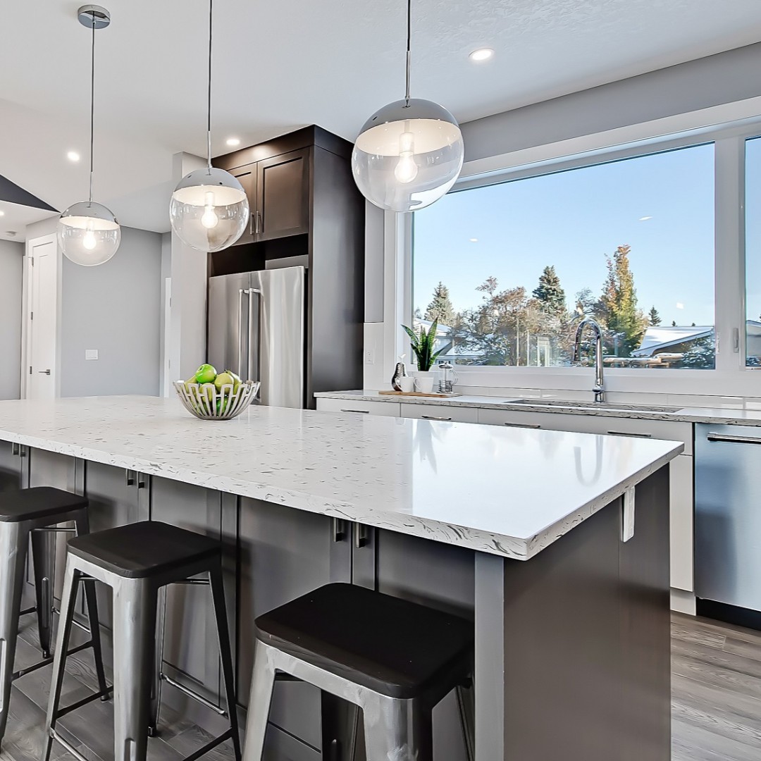 This kitchen is finished using the Tofino door style in True White from our 50th Anniversary colour collection on the upper cabinets and the Ice-House door style finished in the standard Bark stain colour for the lower base cabinets.